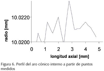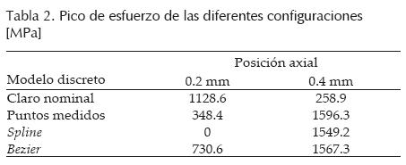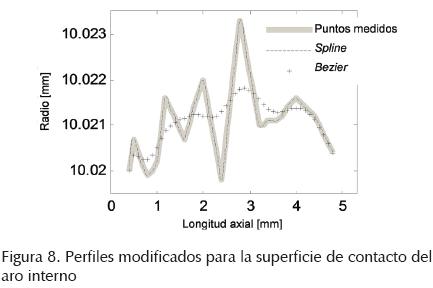 Los resultados corresponden a las 3 aproximaciones del perfil de contacto del aro interno y la flecha usados en el análisis. Para simular los cambios del perfil de la unión mecánica se usa el tamaño característico del elemento de contacto que se obtuvo del 5o refinamiento (tabla 1). Ese refinamiento proporciona ed= 0.4%, lo cual se considera como un excelente nivel de exactitud. Para el análisis del esfuerzo de contacto en la unión se incluyen claros radiales para la geometría nominal en el modelo discreto axisimétrico. Posteriormente y en forma separada se incluyen las modificaciones del perfil de contacto con modificación directa con puntos medidos, interpolación mediante curva spline, e interpolación mediante curva Bezier. En las figuras 8 y 9 se observa que los puntos iniciales y finales son coincidentes para las diferentes representaciones del perfil de contacto; sin embargo, el resto de los puntos difieren, lo que produce variaciones en los resultados de esfuerzos de contacto. Para garantizar que las variaciones de los diámetros correspondan a efectos de las tolerancias de manufactura (considerada como ondulación), la región de interés se limita al rango de variaciones radiales presentado en las figuras 8 y 9. De igual manera, por esta razón no se consideran variaciones cercanas a los bordes del aro cónico donde el rebaje en las esquinas no corresponde a ondulación, sino a la característica de acabado.
