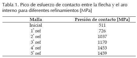 El número de refinamientos requeridos para la convergencia de esfuerzos de contacto se consideró en relación al pico de esfuerzo máximo de contacto en la interfaz flecha -aro interno, en la región indicada como A en la figura 3.