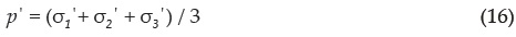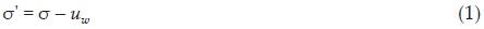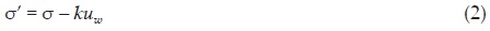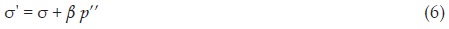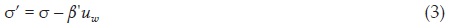 En la ecuación anterior σ' es el esfuerzo normal efectivo, σ es el esfuerzo normal total, β' es un factor de unión, que representa una medida del número de vínculos bajo tensión entre las partículas y uw es la presión de poro.