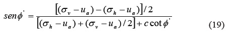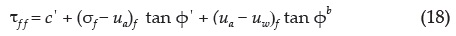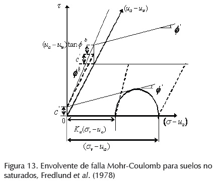 En donde, τff es la resistencia cortante en la falla, c' es la cohesión efectiva, (σf - ua)f es el esfuerzo normal neto en el plano de falla, ua f es la presión del aire en los poros en el plano de falla, Φ' es el ángulo de fricción interna asociado con el esfuerzo normal neto, (ua - uw)f es la succión mátrica en el plano de falla y Φb es el ángulo de fricción que indica la razón en que cambia la resistencia cortante con respecto a la succión mátrica. Las variables descritas de esta ecuación se pueden representar en las figuras 13 y 14 utilizando los círculos de Mohr.