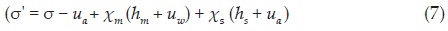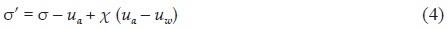 Bishop (1959) sugiere otra ecuación de esfuerzos efectivos para suelos no saturados (4), en esta ecuación se incluye un parámetro hidromecánico χ, que es difícil de evaluar.