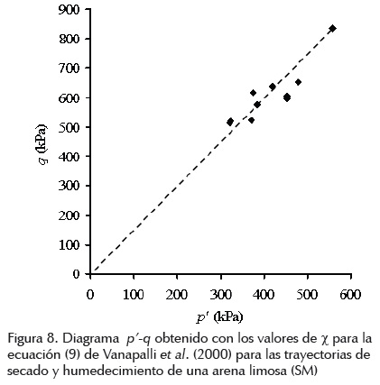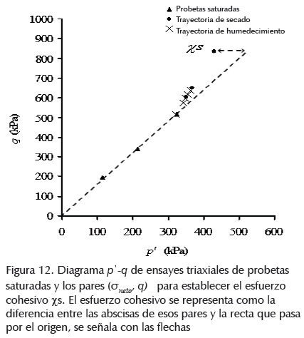 En la figura 7, los valores de c experimentales se han obtenido a partir del conocimiento de M del diagrama p'-q de la serie de probetas saturadas de ensayes triaxiales, realizadas a presiones de confinamiento de 50,100 y 150 kPa. En este caso, la recta que representa los pares (p', q) pasa por el origen, y si en este diagrama se representan los pares (σneto, q) la diferencia entre las abscisas de estos puntos con esa recta representa el esfuerzo cohesivo χs, y como s es determinada en laboratorio, entonces es posible conocer χ. Este procedimiento es equivalente a despejar el parámetro χ de la ecuación (15), (figura 12).