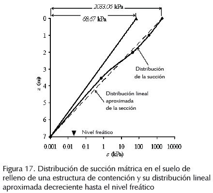 La altura de la estructura propuesta es H= 4.0m, el ángulo de fricción interna es Φ' = 39.25º, la cohesión efectiva es c' = 0, el peso específico promedio del suelo es γ =17.06 kN/m3, el grado de saturación medido en la superficie es Sw =17.46%, el parámetro χ =0.061 obtenido con la ecuación (9) para κ=1.6. La distribución de la succión mátrica en una sección del suelo de relleno actuante en el respaldo de la estructura se presenta en la figura 17.