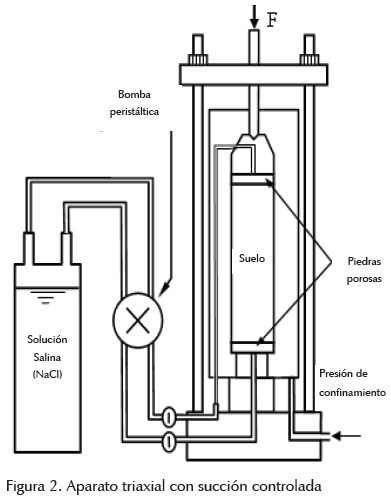 En un equipo convencional de pruebas triaxiales, la succión cambia a medida que se aplican las diferentes etapas de carga. En este trabajo se controla la succión con una bomba peristáltica, que hace circular aire con humedad relativa constante, esta humedad se obtiene de la evaporación de agua generada en un recipiente con solución de cloruro de sodio; el recipiente no se llena totalmente para tener un espacio en que se aloje la evaporación del agua de la solución a una temperatura de 20°C. La concentración de sal se determina para cierta succión que se desee inducir a la probeta de suelo. El recipiente en su parte superior está provisto de una tapa con dos orificios, de uno de ellos succiona el aire húmedo con la bomba peristáltica y se lleva a uno de los extremos de la probeta de suelo colocada en la cápsula triaxial. Por el otro extremo de la probeta se conecta otra manguera para continuar con el flujo del aire en la misma dirección de circulación, ésta se lleva hasta la bomba peristáltica y se retorna hasta el recipiente, de tal forma que se tiene un circuito cerrado en condiciones isotérmicas e isobáricas. El flujo de bombeo fue de 8.81 ml/min que corresponde a una velocidad de 15 rpm de la bomba peristáltica (marca Dynamax modelo RP-1 peristaltic diseñada para transferencia de fluidos). Se describe el sistema en la figura 2.