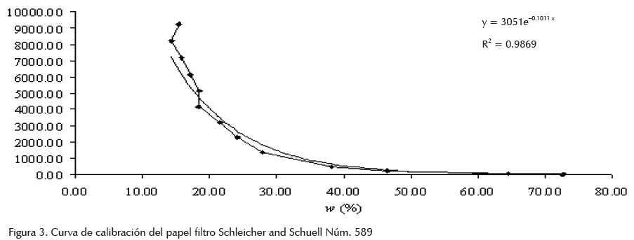 En la parte inferior y superior de las probetas de suelo se colocaron dos papeles filtro para determinar la humedad obtenida por contacto con la muestra de suelo y con ello determinar la succión al final de la prueba triaxial. Con este equipo se realizaron dos series de pruebas de compresión triaxial del tipo consolidadas drenadas (CD), teniendo un esfuerzo de confinamiento de 150 kPa y con una velocidad de deformación aplicada de 0.001 mm/min. Las probetas fueron preparadas por presión en forma estática en cinco capas de 0.70 N de peso cada capa, con una presión de 3140 kPa. De esta forma se controló el peso específico seco de 14.889 kN/m3 y la humedad de remoldeo de 19.53%. Una serie de probetas de suelo fue realizada para la trayectoria de humedecimiento y otra para la trayectoria de secado. Al final de cada prueba se verificó la succión con la metodología del papel filtro de acuerdo a la norma ASTM D 420-D-5611. En la figura 3 se indica la calibración del papel filtro utilizado (Schleicher and Schuell Núm. 589).