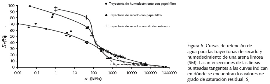 Los grados de saturación residuales utilizados en la ecuación (10) fueron obtenidos de las curvas características, siendo el grado de saturación residual Sr = 0.04 para la trayectoria de humedecimiento y Sr =0.0325 para la trayectoria de secado. Éstos se obtienen trazando un par de líneas tangentes en el cambio de curvatura de las curvas características; una tangente se traza en el tramo de mayor pendiente de la curva y otra en el tramo final de la misma, en donde la succión presenta mayores valores y en el punto de su intersección se encuentra el Sr, los trazos de esas tangentes se indican en la figura 6.