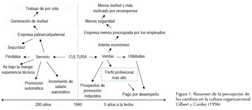 Con base en lo anterior, observemos ahora el cuadro de la figura 1, en el que según la propuesta de Gilbert y Cordey (1996), se percibe que la cultura organizacional de los directivos de las empresas en las que están insertos los diferentes tipos de trabajadores, incluyendo a los profesionistas, se ha modificado enormemente de hace unos veinte años a la fecha. La situación no es irrelevante, sino por el contrario, es extraordinariamente importante y debe estudiarse con mucho cuidado.