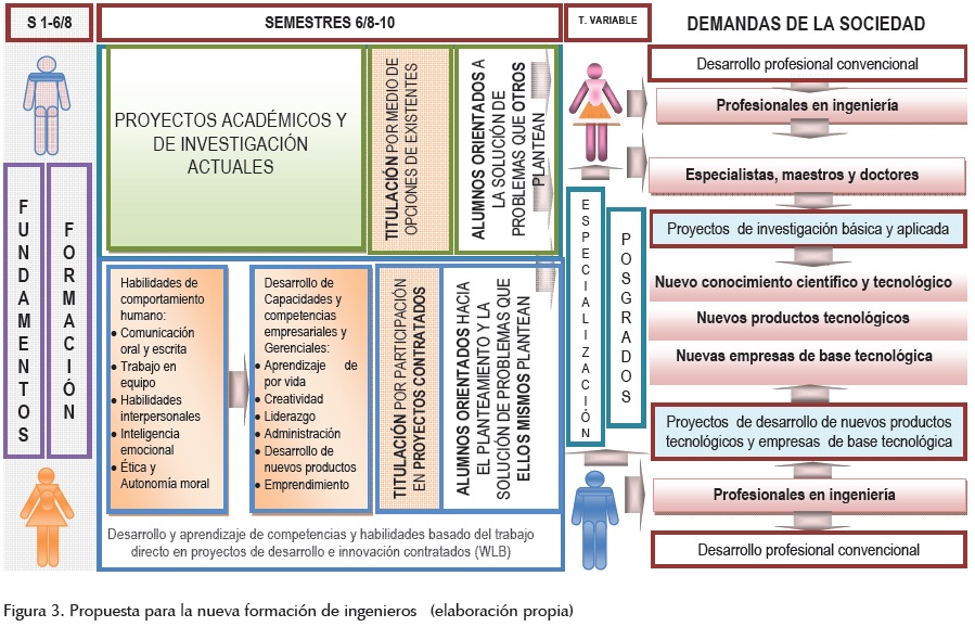 En la parte baja y a la izquierda de la figura 3, podemos observar que la parte principal de la nueva propuesta para la formación de ingenieros es que a diferencia del esquema de formación tradicional, los alumnos puedan enlistarse en proyectos de desarrollo tecnológico o innovación contratados por la universidad con empresas u organizaciones externas, en el contexto del sistema de aprendizaje por trabajo (WBL), propuesto por Inceoglu y Shukla (2011). El esquema propuesto podría entenderse como una opción terminal para las carreras de ingeniería a través de un Seminario de Proyectos de Desarrollo Tecnológico e Innovación. La idea no es nueva, ya que se promueve desde hace algunas décadas en los países desarrollados.