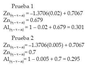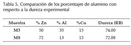 Por último, otra utilidad que tienen las ecuaciones 3 y 4, es la de obtener la equivalencia de dureza, de acuerdo con el porcentaje de Al o Zn. Para demostrar esto se tiene por ejemplo la muestra M8 y la muestra M3, que tienen casi la misma dureza, pero diferente porcentaje de Al y Zn (tabla 5).