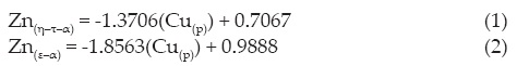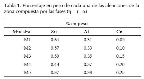 Donde Zn(η-τ-α) y Zn(ε-α) es la fracción en peso de zinc y Cu(p) es el porciento en peso de cobre. En las tablas 1 y 2 se muestran los porcentajes en peso de cada una de estas aleaciones.