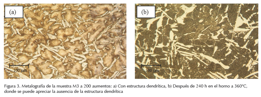 Las figuras 3a y 3b, muestran la probeta M3 en estado de colada y después del proceso de homogeneizado, en estas metalografías se puede apreciar cómo desaparece la estructura dendrítica.
