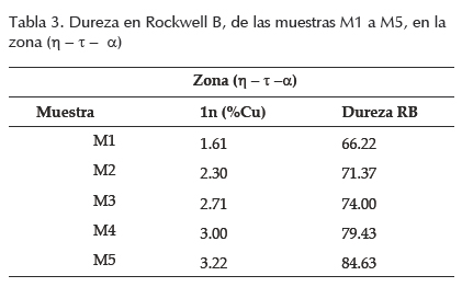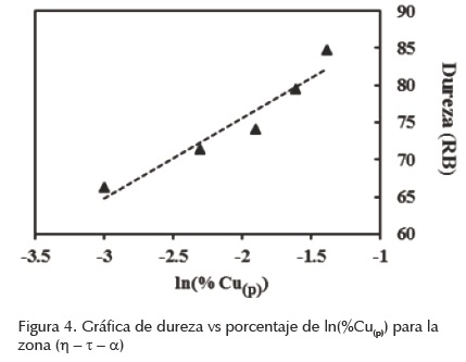 En la figura 4 se muestra el gráfico de la dureza de la serie (η-τ-α) vs el porcentaje en peso de Cu en forma logarítmica. Las razones para emplear la función logarítmica son primero, obtener una regresión lineal que se ajustará mejor a los resultados y segundo, debido a que no es posible matemáticamente tener un logaritmo 0, esta función se ajusta mejor a la realidad de una aleación ternaría, en la cual sería imposible tener cero por ciento en uno de los tres elementos, de otra forma sería binaria. La tabla 3 muestra las mediciones de macrodureza en Rockwell B.