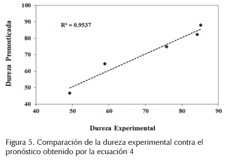 Utilizando la ecuación (4) se comparan las durezas experimentales con las pronosticadas, como se muestra en la figura 5, con una R2 de 0.9537; lo cual muestra que al igual que en el caso anterior, se tiene una ecuación que proporciona un pronóstico con un error menor que 5%.