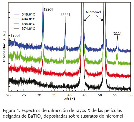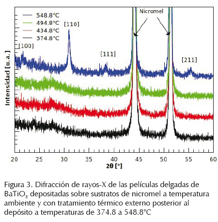Por otra parte, en la figura 3 se muestran los espectros de difracción de rayos X de las películas de BTO, depositadas sobre sustratos de nicromel a temperatura ambiente y con tratamiento térmico externo de 375°C a 549°C. En los difractogramas, los dos picos de alta intensidad, que se encuentran a 44° y 51.3°, corresponden a las reflexiones de nicromel, mientras que los picos restantes que se encuentran a 22°, 31.4°, 38.6° y 55.9°, fueron indexados utilizando la tarjeta 050626 de los archivos de difracción de polvos (PDF, por sus siglas en inglés) correspondiente a la fase tetragonal del BTO.