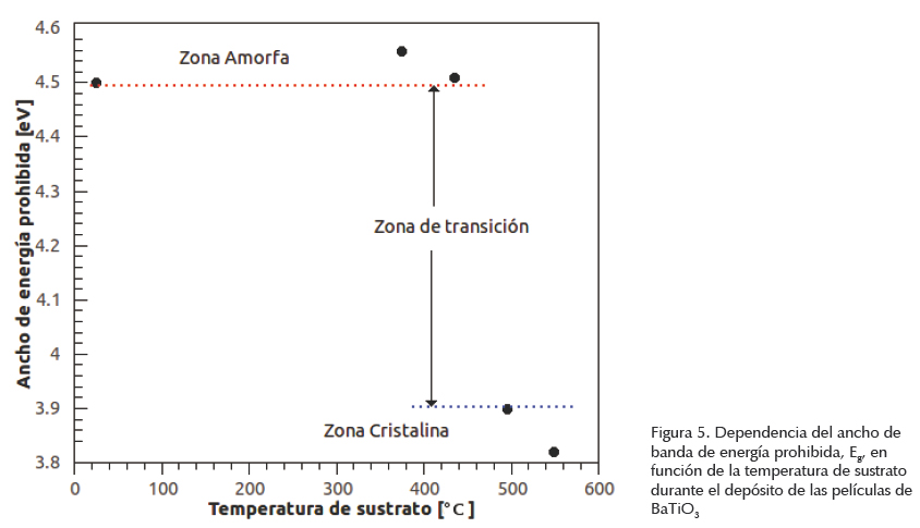 Los resultados del cálculo del Eg para las películas crecidas con temperatura de sustratos se grafican en la figura 5, además del Eg de una muestra crecida a temperatura ambiente (23°C) para referencia. Se pueden observar 3 regiones dependiendo del valor del Eg obtenido. La primera con valores Eg ≥ 4.51 eV, una segunda con Eg ≤ 3.9 eV y una tercera zona intermedia, o de transición, entre las dos primeras. De acuerdo con lo reportado por otros autores (Pasierb et al., 1998; Thomas et al., 1999; Panda et al, 1998; Joshi y Desu, 1997; Thielsh et al, 1997) los valores Eg ≥ 4.51 eV de películas de BTO corresponden a material amorfo, mientras que valores Eg ≤ 3.9 eV son indicadores de un material cristalino. Lo anterior sugiere que para temperaturas de sustrato iguales o por debajo de los 434.8°C las películas son amorfas mientras que cuando la temperatura de sustrato es igual o superior a 494.8°C es posible obtener películas con buena calidad cristalina. Además, en la figura 6 se puede observar que no se presenta ningún valor dentro de la zona de transición, lo que sugiere que las películas no presentan fases secundarias como la cúbica. Es importante remarcar que estos resultados parecieran contradictorios a lo obtenido en el análisis de difracción de rayos-X para la película crecida con temperatura de sustrato de 434.8°C, ya que de acuerdo con la figura 4, existe un pico de difracción que indica la presencia de material cristalino en esta película, mientras que en la figura 5 se observa que su Eg corresponde al de un material amorfo. Sin embargo, esto puede explicarse por el hecho de que en la frontera de temperaturas para la zona amorfa, los materiales crecidos son predominantemente amorfos con un bajo grado de cristalinidad (lo que origina la aparición del pico de difracción de baja intensidad como se ve en la figura 4), por lo que la luz es absorbida es su mayoría por el material amorfo, enmascarando la presencia del material cristalino y dando lugar a un Eg en la región amorfa.