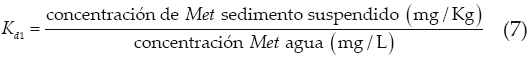 La tabla 1 en la sección de resultados, muestra los datos que se utilizaron en el modelo HEC-RAS para alimentar la ecuación de balance de masa en diferencias finitas, obteniéndose las concentraciones de metales para diferentes condiciones iniciales de concentración y para cada estación a lo largo del río. El coeficiente de partición Kd se calculó con valores de concentraciones de metales en agua, sedimento suspendido y depositado, medidos de manera directa en el terreno en las zonas de muestreo 3 a 7. El valor Kd1 corresponde a concentración de sedimento suspendido (ecuación 7) y el Kd2 (ecuación 8) a sedimento depositado, según la definición clásica (Allison, 2005) y sus valores se muestran en el apartado de resultados.