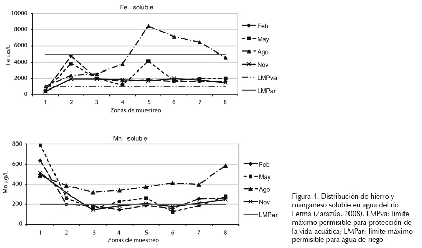 Los resultados de concentraciones medidas de los metales Fe y Mn presentes en el agua, sedimento suspendido y depositado se muestran respectivamente en las figuras 4, 5 y 6. Es evidente que el comportamiento en la distribución de Fe soluble en agua del río es distinto a la distribución de Mn, porque el Fe presentó los valores más bajos en los sitios 1 y 8, mientras que se observó el caso opuesto para el Mn con valores máximos en los sitios 1 y 8. Precisamente la concentración de Fe fue superior al límite máximo permisible para agua de uso en riego en el mes de agosto que corresponde a la temporada de máximas lluvias. Los resultados de Fe en el sitio 1 de Almoloya del río se mantuvieron por debajo del límite para la protección de la vida acuática en los cuatro meses correspondientes con las campañas de muestreo.