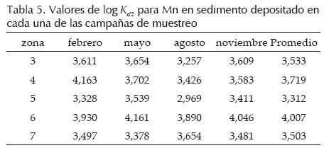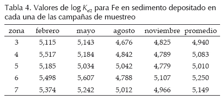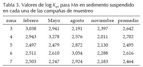 Las diferencias en la concentración de Fe y Mn en los diferentes periodos analizados y en diferentes sitios, tanto en agua, sedimento suspendido y sedimento depositado indicaron que los valores del coeficiente de partición es distinto en cada temporada y sitio del río, por lo que en este trabajo se utilizaron para las simulaciones numéricas los Kd medidos, con lo cual se demuestra que se debe variar el coeficiente de partición dependiendo del periodo analizado y del sitio del río. Para evaluar la variación del comportamiento de las concentraciones de estos metales se calcularon los coeficientes de partición agua-sedimento de 5 zonas de muestreo, que corresponden con el tramo del río entre las secciones; carretera México-Toluca y presa Alzate, para cada campaña de muestreo, por medio de las ecuaciones 7 y 8. Los valores obtenidos se muestran en las tablas 2 a 5 (4).