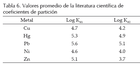 En la tabla 6 se muestran coeficientes de partición para diferentes metales producto de diferentes trabajos, los cuales fueron promediados por Allison (2005).