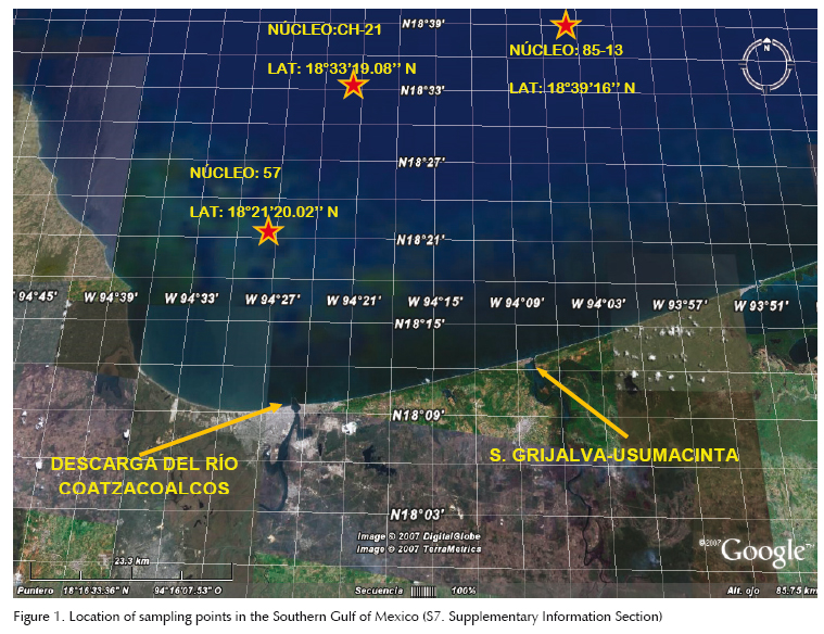 Three sediment cores were collected on board of the B/O (Oceanographic Vessel) Justo Sierra which belongs to the Universidad Nacional Autonoma de Mexico (UNAM). The collection sites for the sediment cores were located at the forefront of the Coatzacoalcos and Grijalva-Usumacinta. The site was affected by a natural oil spill (Figure 1).