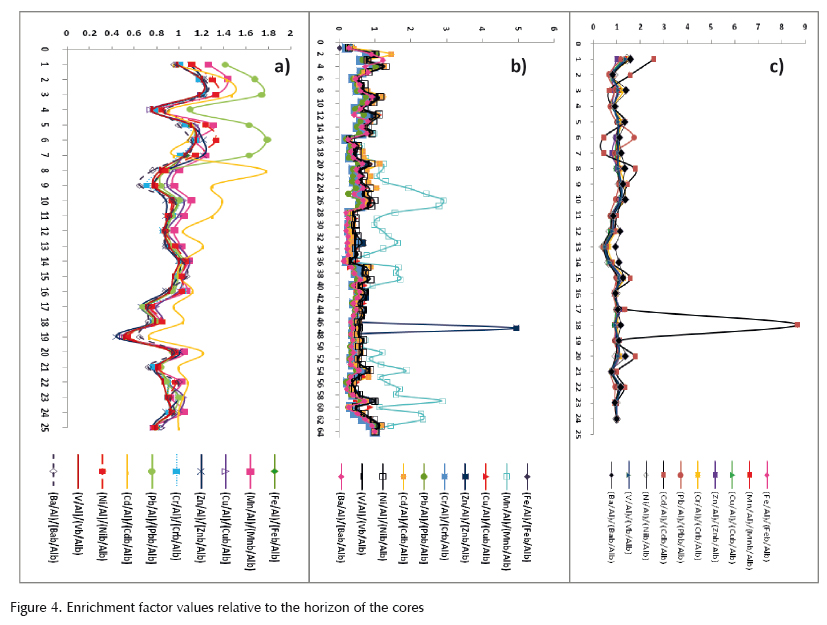 These results may not be attributed to anthropogenic activities, but to the diagenetic processes instead. In contrast, chromium showed and EF value that correspond to the category of high enrichment. We explain these latter values due to the presence of chromite in