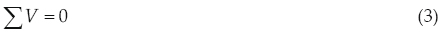 El comportamiento del sistema real se representa por el circuito eléctrico mostrado en la figura 4, pues la división de corrientes en circuitos eléctricos se comporta de forma similar a la ecuación de continuidad 1 y la división de voltajes, a las pérdidas de carga de la ecuación 2. Para establecer la analogía del sistema de tuberías y el circuito eléctrico se considera que las ecuaciones de equilibrio que gobiernan el comportamiento de los sistemas eléctricos son las leyes de Kirchhoff de voltaje y corriente, las cuales establecen la siguiente ley de voltaje de Kirchhoff (ecuación 3): la suma algebraica de las caídas de tensión a lo largo de una trayectoria cerrada es cero.