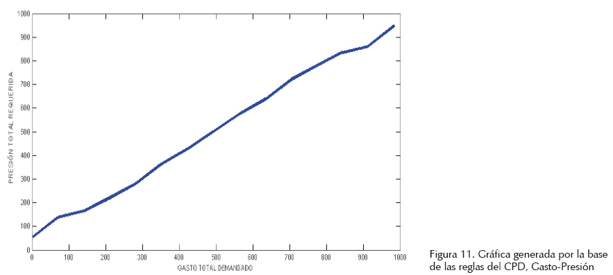 Donde QT, es el gasto que demanda el sistema y P es la presión requerida. La gráfica generada por esta base de reglas se muestra en la figura 11.