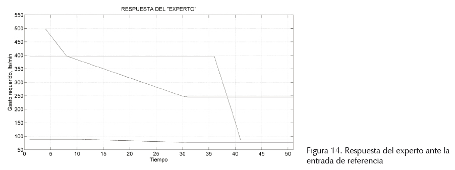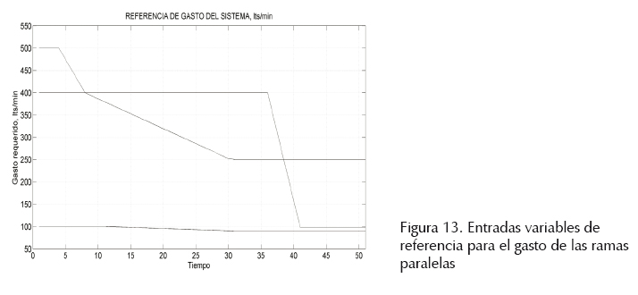 En la figura 13, se muestra la especificación de gasto propuesta para cada rama paralela. Se eligieron esas entradas para que el sistema se comportara como desacoplado, esto es, que ante variaciones de gasto en alguna rama paralela, el gasto de las demás ramas paralelas no se vea afectado. La tarea del experto es definir cómo es el comportamiento del sistema para cumplir con estas especificaciones. En la figura 14 se muestra la salida del experto, que es la salida de la figura 5 ante las entradas de la figura 13.