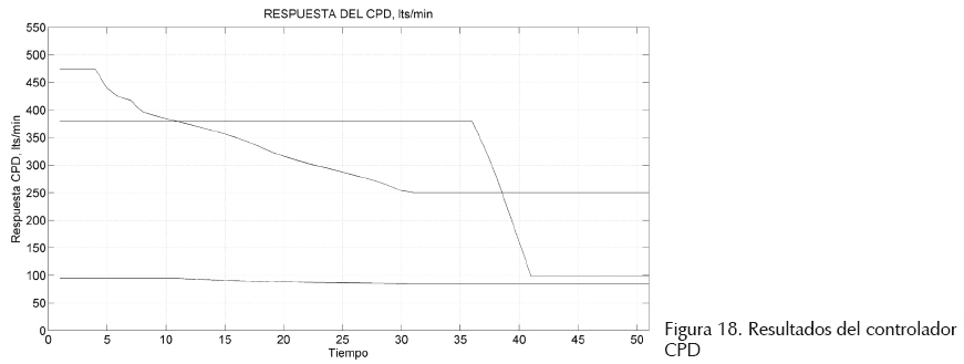 Las entradas de referencia muestran cambios de demanda de gasto en cada rama paralela mostrados en la figura 13; de esta manera, el experto P determina el comportamiento de las válvulas y la bomba, lo cual se aprecia en la figura 14, y por último, en la figura 18 se observa el buen funcionamiento del CPD propuesto, el cual logra el objetivo de desacoplamiento. También, en la figura 19 se muestra la demanda de gasto (presión determinada por el CPD propuesto).