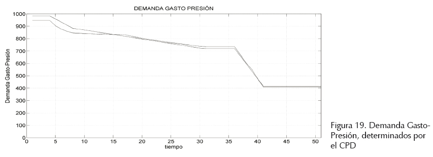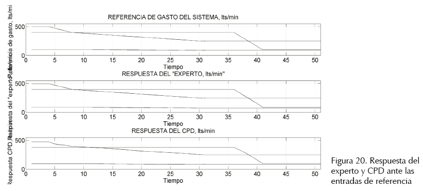 En la figura 19, se observa que la demanda de gasto requiere una presión proporcional suministrada por la bomba, es decir, la demanda de gasto se satisface en proporción a la demanda, así el sistema cumple con el objetivo de desacoplamiento, conseguido por el CPD. Por último, se muestran en la figura 20, las referencias de gasto para cada rama paralela, la respuesta del experto y el desempeño del CPD.