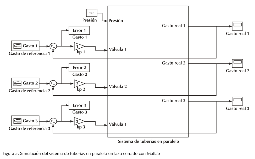 Por ejemplo, si se disminuye el gasto en alguna rama y se desea no afectar a las demás, la acción sobre el sistema será disminuir el gasto para que sólo satisfaga la demanda necesaria del sistema, de igual forma si la demanda aumenta, entonces el gasto debe aumentar para satisfacer lo necesario. Esta forma de control se asemeja a un controlador proporcional. Para verificar que este comportamiento desacoplado se podría lograr, se simuló en Matlab el sistema mostrado en la figura 4, el cual está representado en el bloque llamado "sistema de tuberías en paralelo" de la figura 5. En este diagrama se consideró un bloque de ganancia unitaria que representa un controlador proporcional; las entradas son señales de demanda de flujo aleatorias, es decir, existe variación en la demanda de flujo para ciertos lapsos de tiempo. El bloque que ingresa el valor de la presión es constante para cada rama paralela, que como ya se comentó en este sistema la presión es igual para cada rama. El controlador proporcional (P) determina el valor para cada válvula y la información del error entre el flujo deseado y el real es el conocimiento experto. Entonces, con esta información, es posible traducir este error en un controlador proporcional difuso (CPD) el cual puede conseguir el mismo objetivo de control.