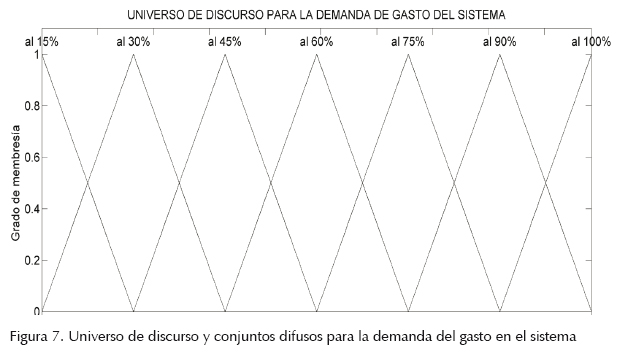 Consideremos como universo de discurso de la variable de entrada para el control del gasto de la bomba el flujo total demandado por el sistema. Para clasificar los conjuntos difusos del universo de discurso de esta variable de entrada, se proponen 7 conjuntos, los cuales se denotan como: demanda de gasto de 0 a 15%, demanda de gasto de 15 a 30%, demanda de gasto de 30 a 45%, demanda de gasto de 45 a 60%, demanda de gasto de 60 a 75%, demanda de gasto de 75 a 90% y demanda de gasto de 90 a 100%, los cuales se muestran en la figura 7.