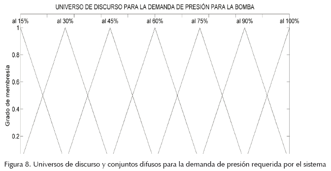 El universo de discurso de la variable de salida es la demanda de presión de la bomba. Para esta salida se proponen 7 conjuntos difusos los cuales son: demanda de presión del 0 a 15%, demanda de presión de 15 a 30%, demanda de presión de 30 a 45%, demanda de presión de 45 a 60%, demanda de presión de 60 a 75%, demanda de presión de 75 a 90%, demanda de presión de 90 a 100%. En la figura 8 se aprecian las funciones de membresía propuestas.