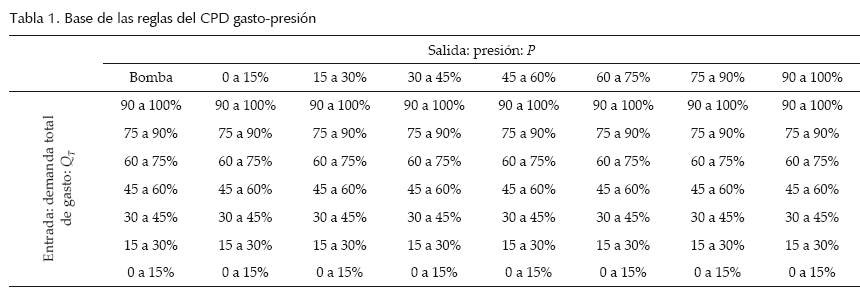 Para el CPD que controla la presión de la bomba, la base de las reglas se da en la tabla 1, la cual contiene siete conjuntos de entrada difusos y siete conjuntos de salida difusos.