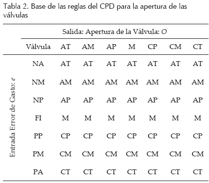 Para el CPD que controla el gasto en cada una de las ramas paralelas de la tubería, se tiene que la base de las reglas está dada en la tabla 2, la cual contiene siete conjuntos de entrada difusos y siete conjuntos de salida difusos.