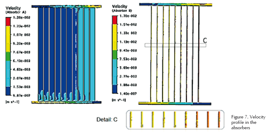 Fan et al. (2007) investigated the performance (experimentation and CFD simulation) of a U-type solar collector, where the flow passes through a rhombusshaped cross section in a 16-section array with this geometry. Varying the flow from 150 l/h to 1500 l/h, the velocity characteristic curves show similar performances to those shown in Figure 8, in which the farther the duct is from the fluid inlet, the higher the flow velocity is in that respective duct (for the first half of the total amount of ducts). For the other half, a mirror view of such curves can be considered because Fan used a U-type collector, while this study evaluates a Z-type one.