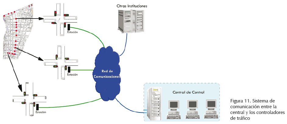 En la figura 11 se muestra el diagrama de interconexión entre la central y los controladores de tráfico de cada cruce, en donde éstos se comunican a través de la infraestructura de un proveedor de servicios de internet o una red TCP/IP dedicada para este fin.