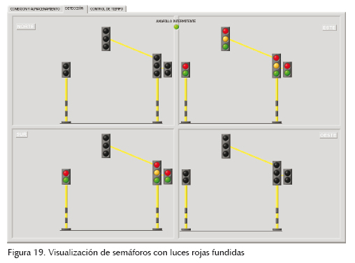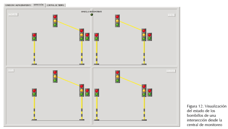 En la figura 12 se muestran los semáforos de los cuatro accesos a la intersección (Norte, Sur, Este y Oeste) visualizados desde la central, de tal forma que si aparecen todas las luces encendidas es porque la intersección se encuentra funcionando correctamente.