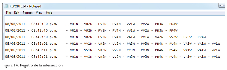 El software presente en la central, almacena en un archivo de texto las anomalías que se presentan en el controlador de tráfico, además se realiza un registro cada 10 segundos del estado de la luces de la intersección. En la figura 14, se observa el tiempo en el que las luces de los semáforos vehiculares y peatonales están encendidas, según la nomenclatura de la figura 8.