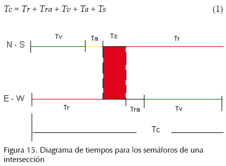 Para la configuración de tiempos de la intersección se tienen en cuenta las recomendaciones vigentes (Verlag, 2010; Alcaldía Mayor de Bogotá, 2005), que sugieren un tiempo mínimo de luz verde de 10 segundos. A partir de este tiempo y teniendo en cuenta el tiempo total del ciclo del semáforo (Te), que es de 60 segundos, se presenta el diagrama de tiempos para cada vía (Norte-Sur, Este-Oeste) en la figura 15. En esta figura Tv corresponde al tiempo de la luz verde, Ta al tiempo de la luz amarilla, Tra al tiempo de la luz Roja-Amarilla, Tr al tiempo de la luz roja y Ts es el tiempo de seguridad.