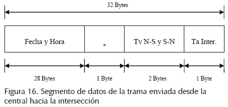 En el campo de datos de la trama que se envía desde la central de monitoreo a la intersección, al inicio se configura la fecha y hora actualizada de la central, después se establece el TvN-S y por último, se fija el tiempo de luz amarilla intermitente, en caso de que la central determine poner en este estado a la intersección. Esta trama de 32 bytes se observa en la figura 16.