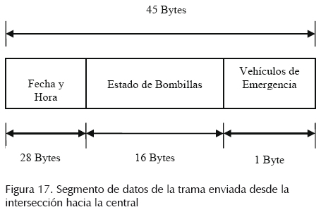 En la trama que se transmite desde el controlador de tráfico hacia la central, se envía información que corresponde a los reportes sobre el estado de la intersección monitoreada. Como se presenta en la figura 17, la trama está estructurada con la fecha y la hora, el estado de las luces con una tamaño de 16 bytes (1 byte por semáforo), y por último se posee un byte para reportar a la central la detección de algún vehículo de emergencia.