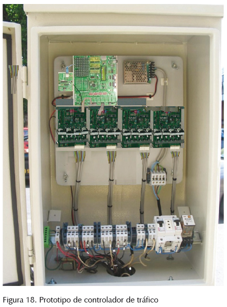 El prototipo de controlador de tráfico, se muestra en la figura 18, consta de dos tarjetas de potencia para semáforos peatonales y otras dos tarjetas para semáforos vehiculares por cada acceso a la intersección. La capacidad de la conexión de internet entre la central y el controlador de tráfico es de 1Mbps.