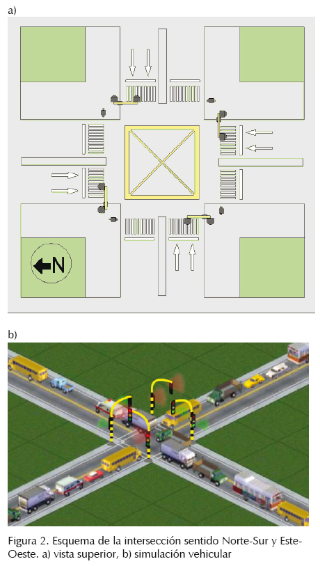 El modelo de intersección planteado es el mostrado en la figura 2, está compuesto por una vía en cada sentido de Sur a Norte y de Este a Oeste, y viceversa. Cada vía presenta un semáforo vehicular doble y dos peatonales en cada acceso a la intersección.