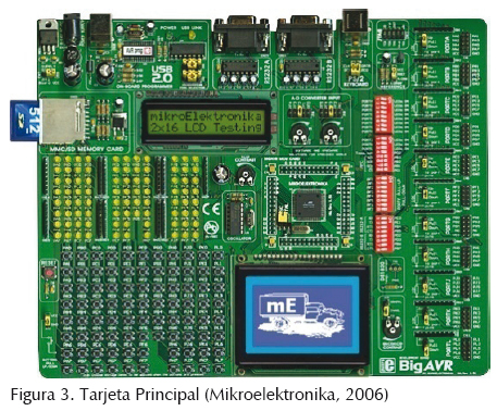 Este módulo se realiza utilizando la tarjeta BigAVR (figura 3), que está compuesta por un microcontrolador de alta gama Atmega 128 de Atmel. Esta tarjeta se escogió para el desarrollo del proyecto, debido a la gran escabilidad y versatilidad que presenta con otros sistemas (Mikroelektronika, 2006).
