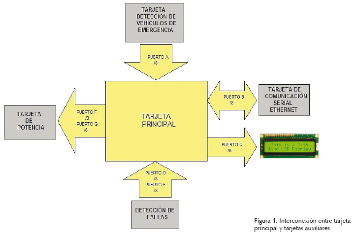 En la figura 4 se observa la interconexión entre los puertos de la tarjeta principal y los módulos auxiliares que permiten el control de la intersección, que son: la tarjeta para la detección de los vehículos de emergencia, la tarjeta Ethernet para la comunicación con la central remota, la visualización con la pantalla LCD y la tarjeta de potencia que permite el encendido de las luces del semáforo y la detección de las fallas que se puedan presentar.