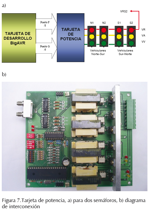 El módulo de potencia desarrollado se muestra en la figura 7a, con la que se activan dos semáforos de grupos diferentes (por ejemplo, Norte-Sur y Este-Oeste) a través de los optoaisladores y los Triacs. Por lo tanto, se necesitan cuatro tarjetas en total para una intersección, dos para los semáforos vehiculares y otras dos para los semáforos peatonales.