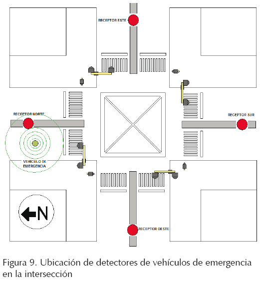 La detección de vehículos de emergencia se realiza por la emisión de señales de radiofrecuencia generadas desde estos vehículos al aproximarse a la intersección y, por ende, se les da prioridad de cruce colocando la luz de este semáforo temporalmente en verde. Esta etapa se implementa utilizando la frecuencia 433.92 MHz, banda libre del espectro radioeléctrico, con un alcance de aproximadamente 120 m. Para la intersección planteada (figura 9) se requieren 4 receptores ubicados a cierta distancia del cruce por cada corredor vial, de manera que se detecte el arribo del vehículo por las cuatro entradas al cruce.