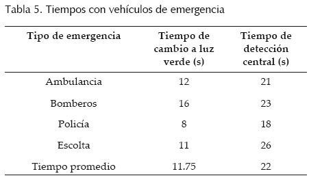 Finalmente, en la tabla 5 se presenta el tiempo en que la central detecta la presencia de vehículos de emergencia y el tiempo invertido por parte del controlador de tráfico para asignar la luz verde prioritaria.