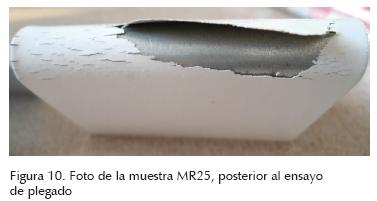 En los ensayos físicos, mecánicos y paramétricos efectuados en las muestras ensayadas, se obtiene para la muestra MR25 un valor promedio de dureza Buchholz de 79, presentando la misma problemas evidentes de fisuración y desprendimiento del recubrimiento en el ensayo de resistencia a la fisuración durante el plegado (figura 10). La muestra MR26 obtuvo valores de dureza Buchholz de 66, ya bastante inferiores al óptimo recomendado por la literatura (Qualicoat, 2012). En la determinación del espesor del recubrimiento (tabla 4), para las muestras MR25 y MR26 se obtienen valores totales promedios de 134.8 μm y 41.1 μm, ambas partiendo de una chapa de acero galvanizado con valor promedio de 20.7 μm de espesor del galvanizado clasificando como G90 (ASTM A653- 2006a); garantizándose en MR25 un espesor del recubrimiento aplicado de 114.1 μm y para MR26 un prelacado con valores aproximados de 8.3 μm, para finalmente aplicar recubrimiento de poliéster de espesor promedio de 12.5 μm. Según la determinación del brillo la muestra MR25 clasifica como categoría II: semibrillante con un 51.5%, y la muestra MR26 como categoría: mate con un 18.1%. La muestra MR26 no presentó afectaciones en el ensayo de plegado (figura 11).
